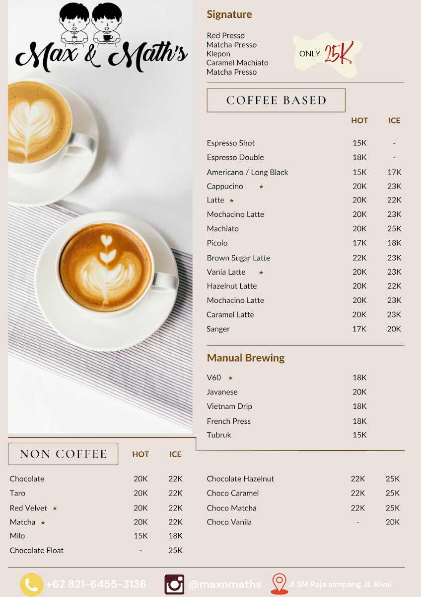 Welcome to Max n Math's, a vibrant new café nestled in Kisaran, Sumatera Utara. This gem is redefining the local coffee scene with its inviting atmosphere and impressive menu. Customers rave about the delightful coffee, especially the coffee latte, which rivals offerings from high-end coffee shops. The energetic vibe makes it an ideal spot for social gatherings with friends and family.